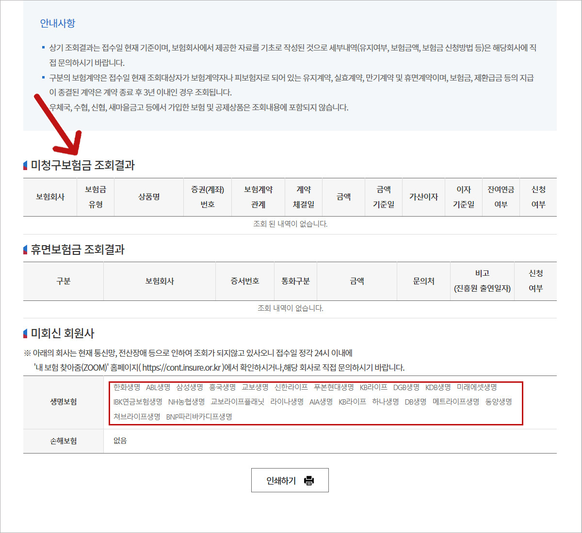 미청구보험금 조회결과에 보험 리스트가 뜹니다만