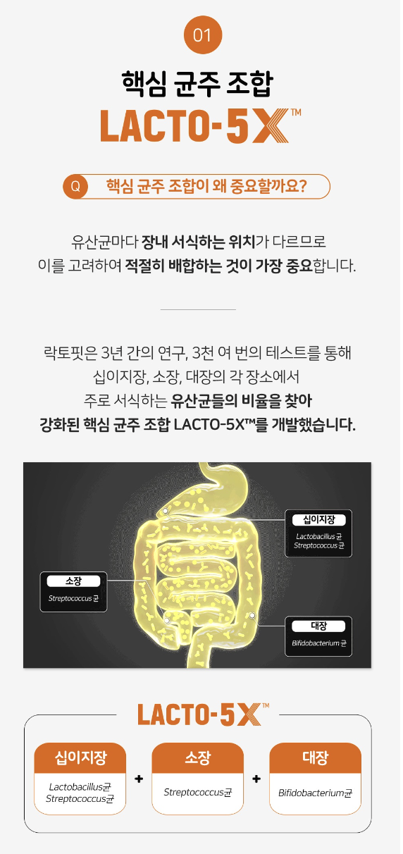 종근당에서 만든 제품으로 LACTO-5X 포뮬러기술로 십이지장과 소장 대장에 필요한 균을 조합해놓았다고 하네요~