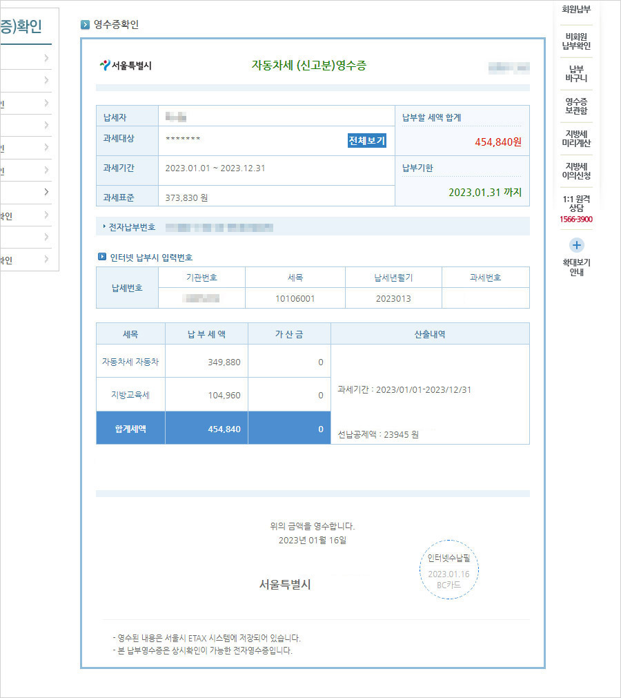 납부세부 내역을 클릭하면 영수증을 볼수 있습니다.