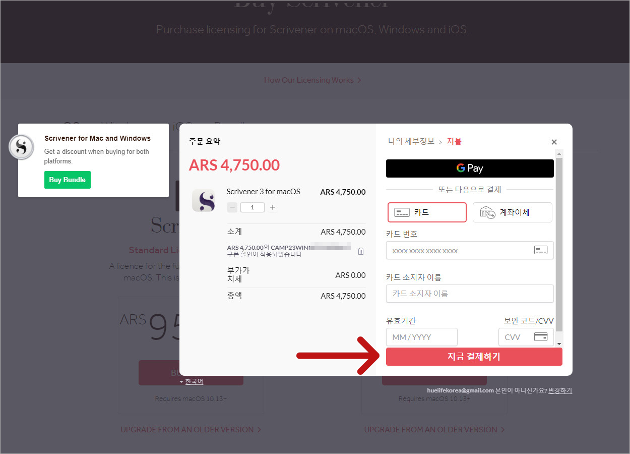 스크리브너 시리얼을 받을 주소를 써넣고,