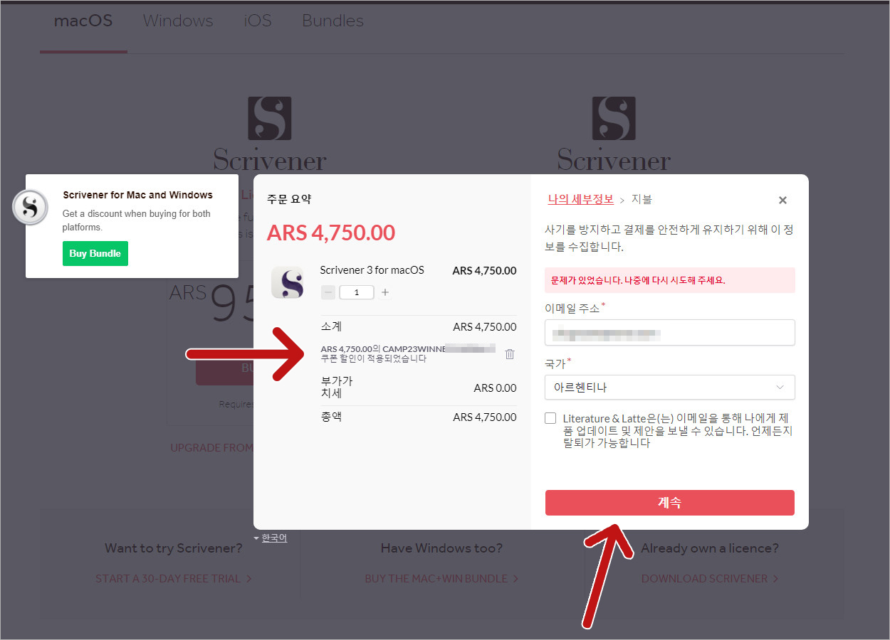 국가를 아르헨티나로 설정후 스크리브너 공홈으로 갑니다.
