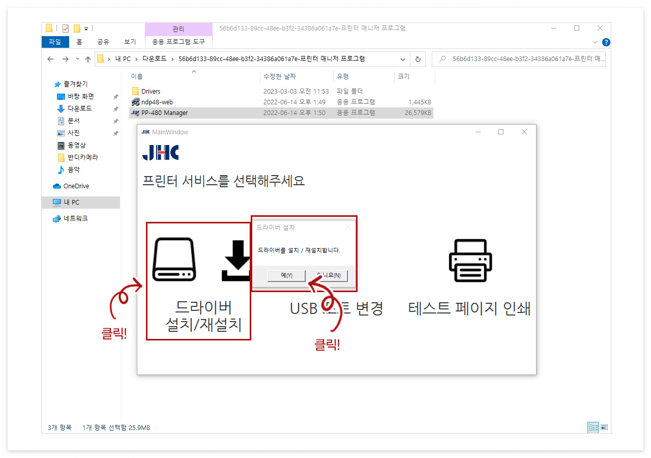 드라이버를 설치 / 재설치 합니다 팝업이 나오면 " 예 "를 클릭 합니다.